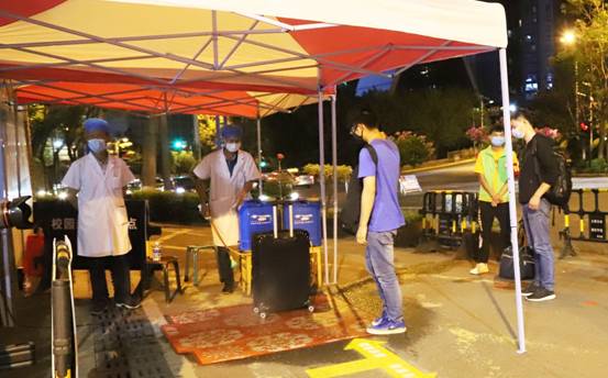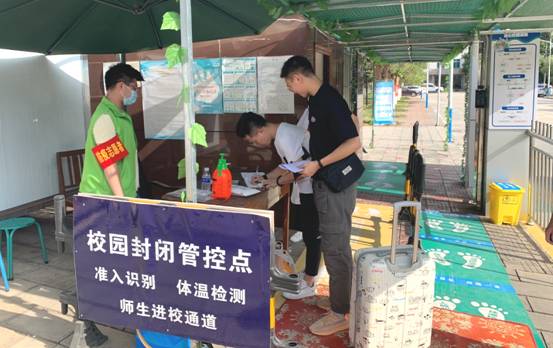 在校门口,志愿者引导返校学生按要求排队有序通过行李消杀、体温检测、人脸识别等环节,信息识别异常的人员在志愿者的耐心指导下登记相关信息,工作人员仔细为学生的行李消毒。