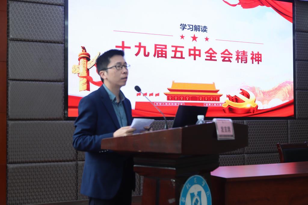 经济与管理学院副院长李博就学习解读十九届五中全会精神作专题讲座。讲座从“三个板块”“三新”“三个战略”等方面对“十四五”规划做了解读,就学校高质量发展如何依托资源优势、产业优势和积极主动融入地方发展战略等方面进行了探讨。